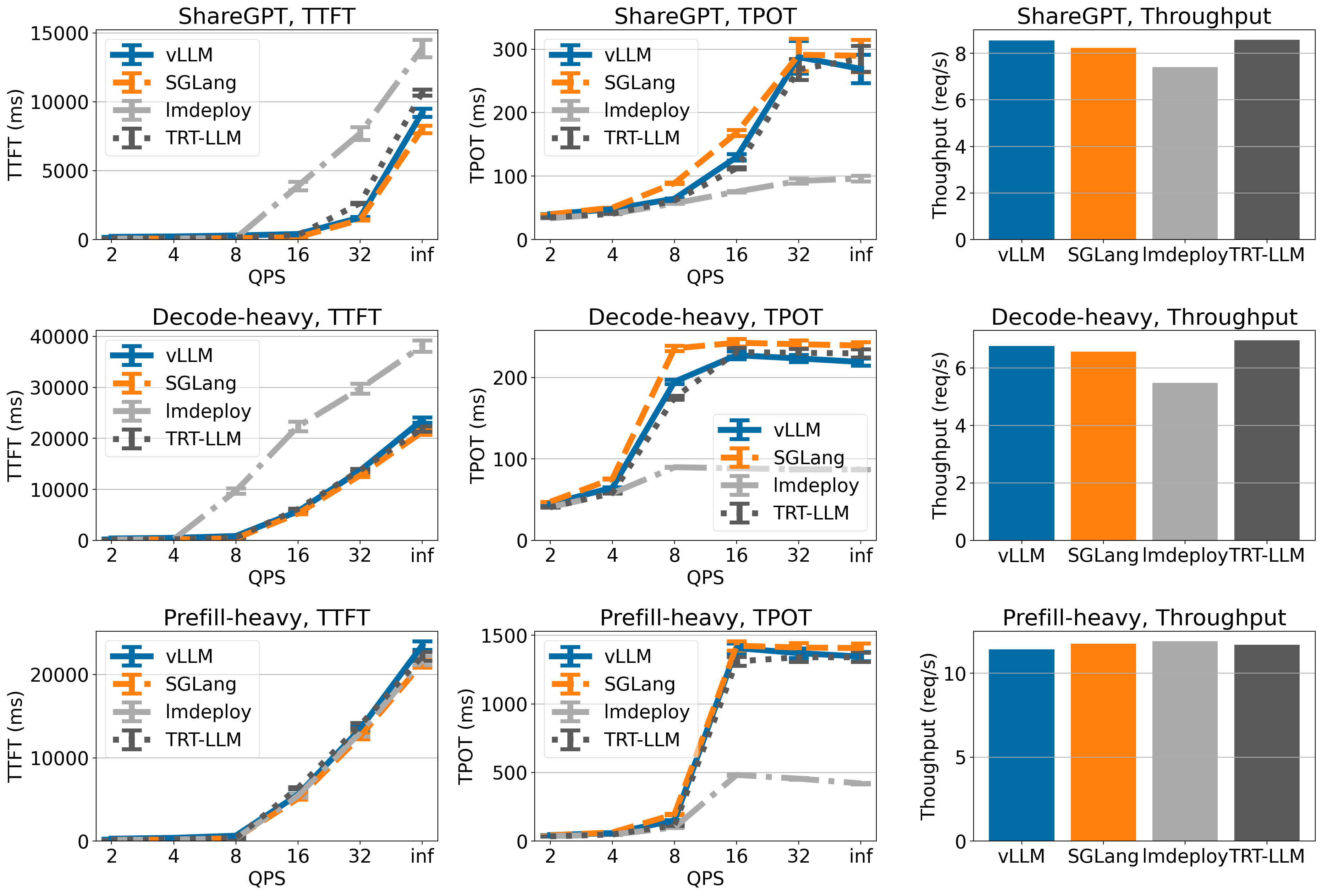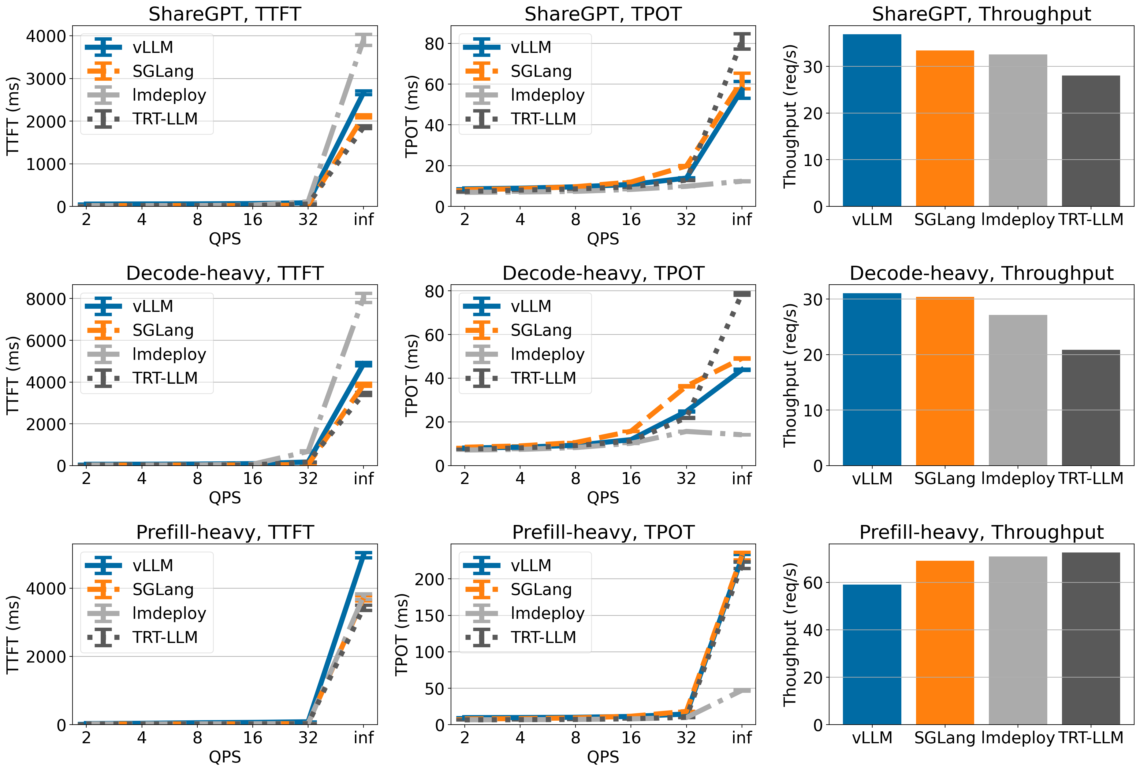 vLLM has highest throughput on ShareGPT and Decode-heavy dataset (though the throughput is only marginally higher than TensorRT-LLM), but the throughput of vLLM is lower on Prefill-heavy dataset.