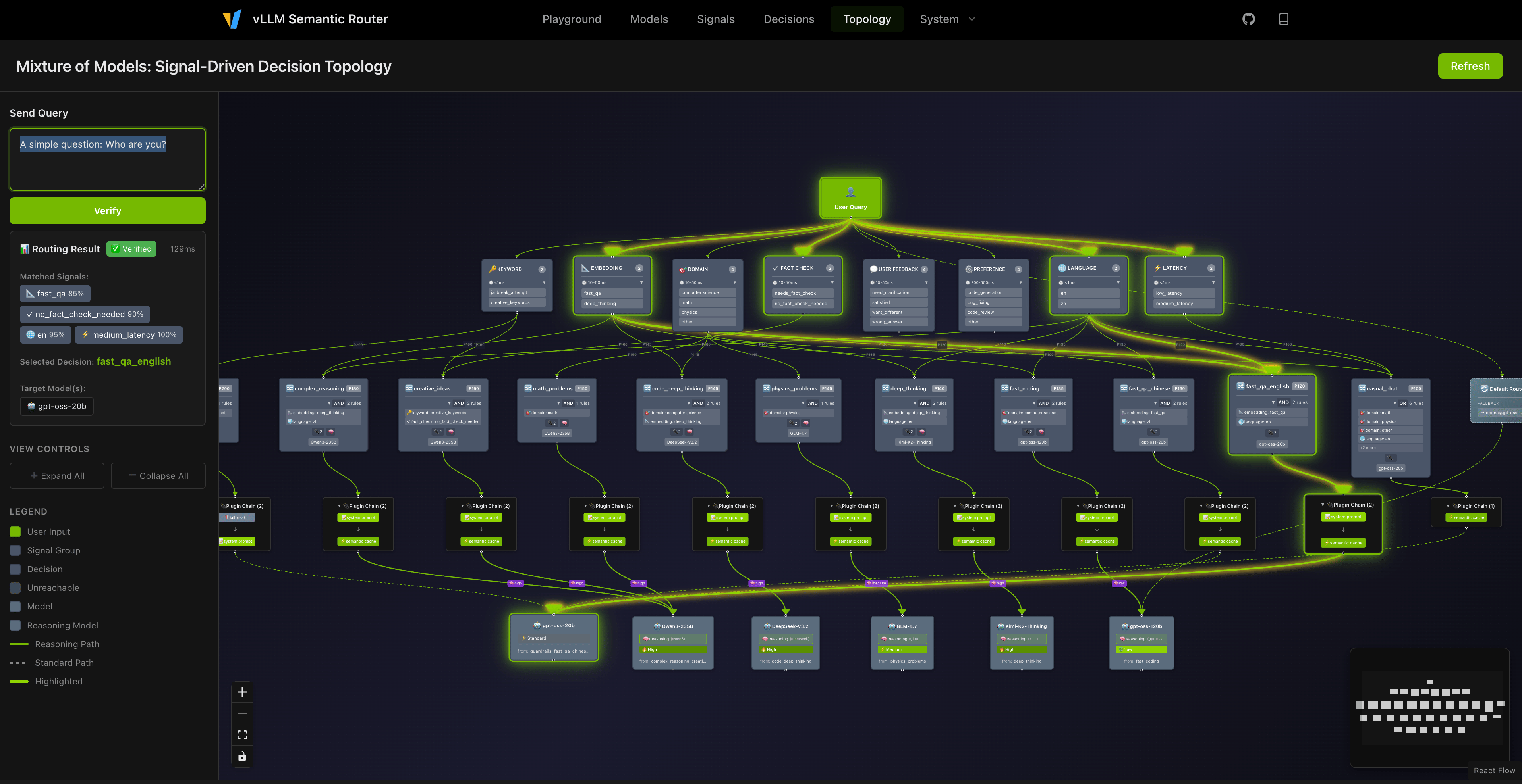 One highlight worth emphasizing: we’ve implemented a topology visualization capability. Beyond displaying static signal-decision relations, it reveals real-time thinking chains triggered by different queries—like watching a giant neural network built from semantics come alive. Each question illuminates different pathways through the model constellation, making the MoM routing logic intuitive and debuggable.